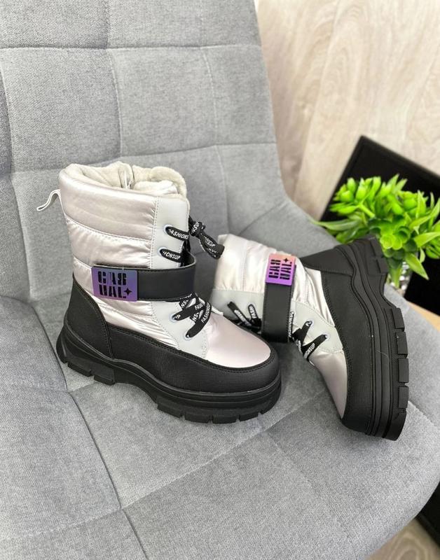 Шикарні срібні дутики від підбренда Tom.m - HT kids.😍 Гарно переливаються рожевим відтінком. Спереду на шнурівці. Є липучка. Збоку блискавка. Усередині утеплені овчиною (60% натур.). Стильно виглядають на ніжці. ❤ 37р. - 23,7см ❗ Вимірювання зроблено всередині по устілці особисто мною, похибка 1-2мм допустима. Устілки можуть не відповідати.