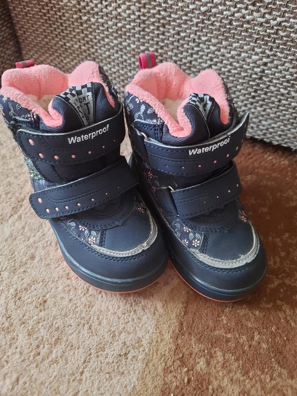 Зимові термо сапожки для дівчинки,утеплені овчиною,23 розмір,устілка 14,5см,носки не збиті,світловідбивальні елементи не стерті,ніжка легко заходить в сапожок,теплі.Стан хороший але є потертість в середині де пряжа залізна на фото видно