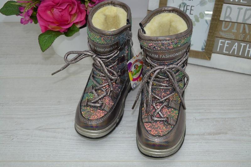 Шикарні чобітки (Луноходи) Зима Якість супер!! Легкі та зручні Верх-шкірзам + кут (блискітки не обсипаються) Усередині густе хутро (60% натуральне) Фіксація на шнурівку. Збоку блискавка Антиковзна підошва Допустима мінливість у Замірах +-1-2 мм 27р-17 см 30р — 18,7 см