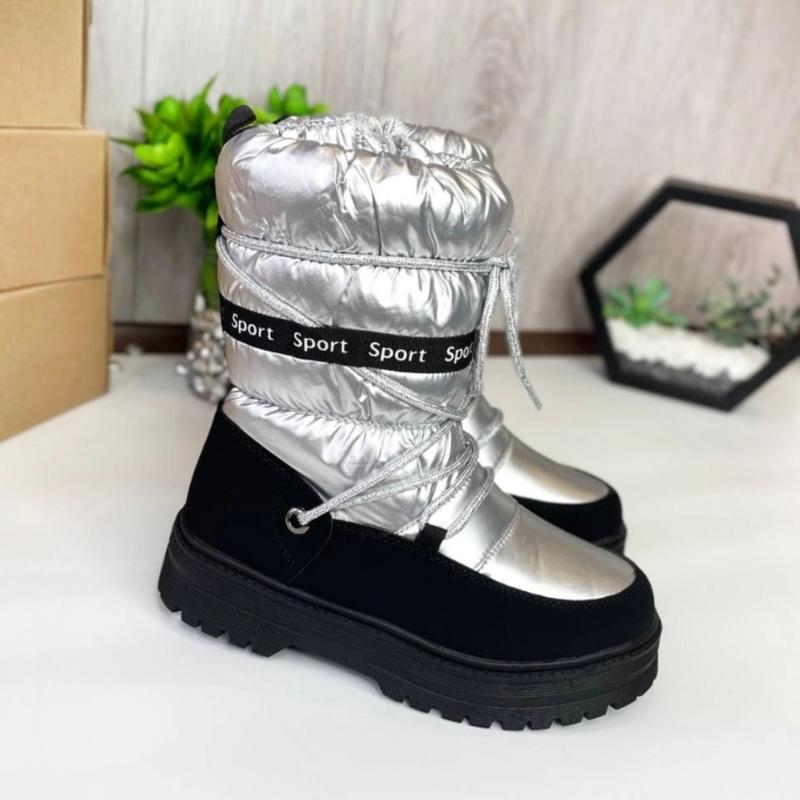 від Tom.m.💎Сріблястого кольору. Спереду на шнурівці, у стилі луноходів. Усередині утеплені овчиною (60% натур.). Збоку блискавка, є захист від протікання вологи. Легенькі. Стильно виглядають на ніжці. ❤ 33р. - 21,8см 35р. - 23,3см 35р. - 23,3см 35р. - 23,3см 35р. - 23,3см 36р. - 23,8см 36р. - 23,8см 36р. - 23,8см 37р. - 24,4см 38р. - 25,2см