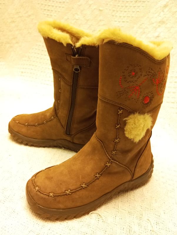 Очень красивые и теплые детские сапожки. Натуральный замш. Натуральный мех овцы. Очень красивое оформление модели. Размер 28- 29. Длина стельки 17.5-18.5 см.