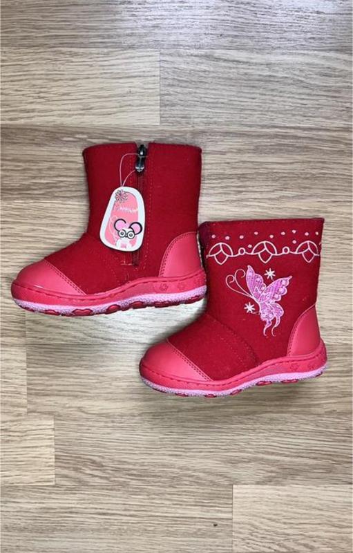 Теплые детские валенки для девочки. Новые. Сверху войлок который поглощает и испаряет влагу, а внутри натуральная овчинка, ( очень теплые, мех густой), меховая стелька- что гарантирует вашим ногам сухость и комфорт ,способны выдержать лютые морозы. Пятка и носок прорезиненные. Цвет: красный Принт: бабочка Размер: 27; 28; 29; 30; 31; 32