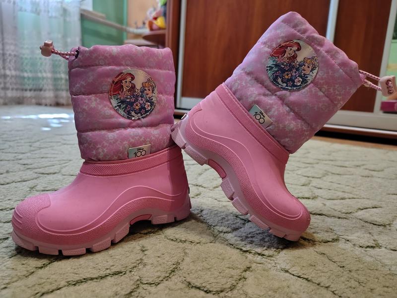 Нові. Розмір 25. Дуже красиві теплі чобітки на дівчинку. Усередині хутро кремового кольору. Верх непромокальний - болонь та гума. Підошва теж гума, не ковзає. Устілка приклеєна. Розмір по підошві – 18.5 см. Думаю, устілка – 18 см, підошва не виступає за межі чобота. Ширина верху чобота регулюється.