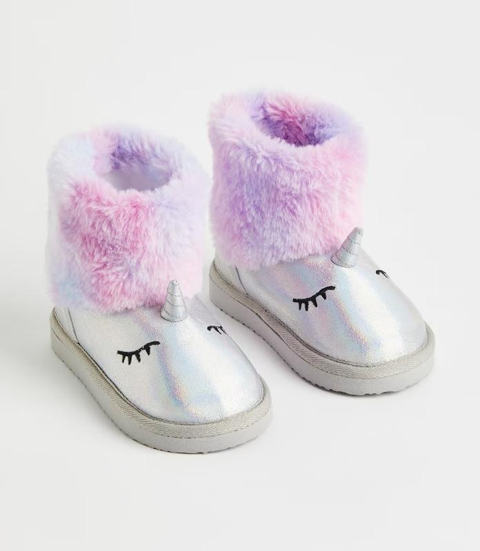Чоботи з теплою підкладкою сріблястого кольору з рожево-фіолетового штучного хутра.Довжина устілки19см