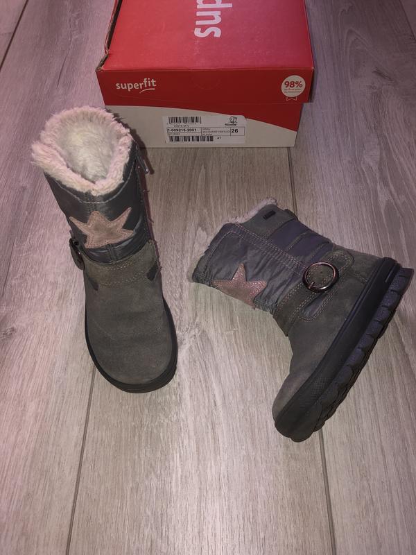 Superfit чоботи розмір 26 устілка 16,5 см, утеплені гортех, стан ідеальний, дитина носила дуже мало. Колір сірий з мерехтінням.