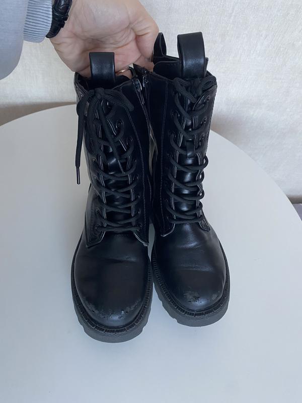 Чоботи з кожзаму теплі, зимні. По стельці 20 см, спереду потертості, на фото видно.