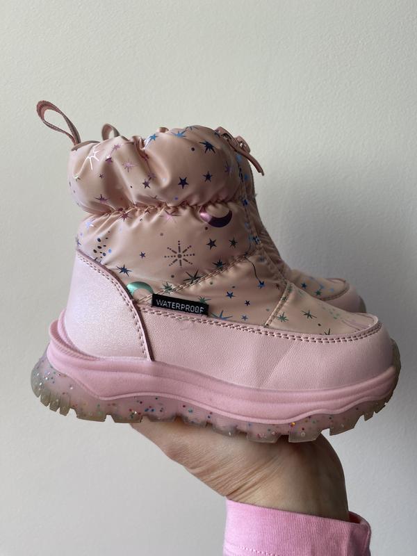 Гарні дутіки з водонепроникної плащівки, утеплені овчиною, взували при -15 і ніжки були теплі. Зручний замочок. Гарний принт, дуже добре зберігся. Підошва в чудовому стані, без нюансів.