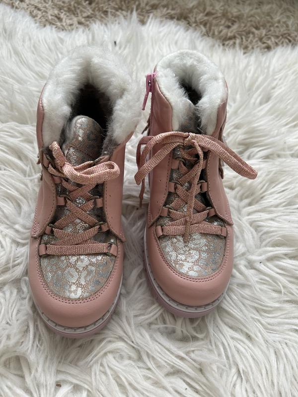 Зимові ботінки доя дівчинки. На цигейці( овчині) верх шкіра, на замку і шнурівці. Не слизькі, теплі. Ніжно рожевого кольору. 28 розмір- по устілці 18 см.