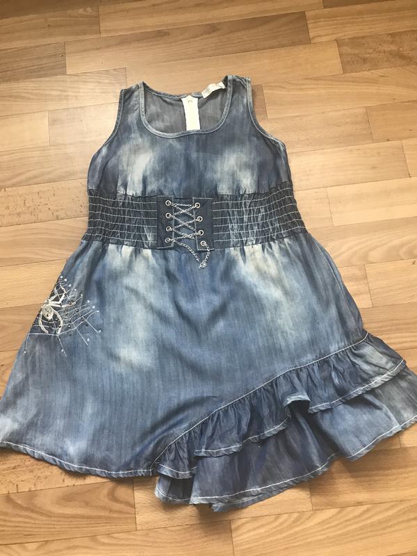 Джинсовий сарафан на дівчинку від бренду Colabear.Колір синій.Розмір 122р.Сарафан виконаний із легкої джинсової тканини.На поясі широка резинка з ланцюжком.По низу красиві рюшки і збоку аплікація павука.Застібка ззаду на блискавці. Склад:100%джинс.