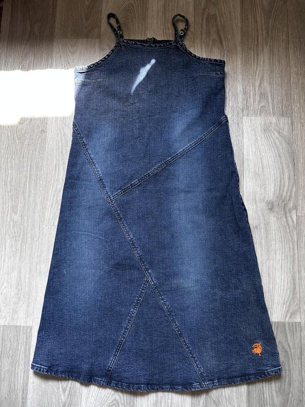 Указан на бирке на рост 158. 97%хлопок, 3%эластан. Состояние очень хорошее. Джинс сам по себе с потертостями. Классный плотный джинсовый сарафан. Я надевала его на рост 169, размер хс, все таки мал - очень давит под мышками)