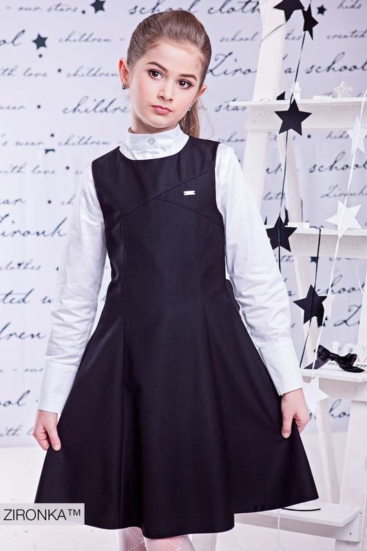 Шкільний сарафан приталеного крою . Спідниця сарафану у формі трапеції. Застібається на сховану блискавку на спині. Має підкладку , завдяки якій не електризується спідниця сарафану. Колір- чорний. Склад: 45% шерсть 55% віскоза