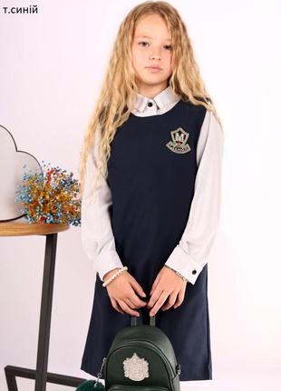Шкільний сарафан. Матеріал: преп-дайвінг. Склад: поліестер, еластан. Країна виробник: Україна. Колір: темно-синій. Заміри: Розмір 134: довжина 72 см, ширина по лінії грудей 36 см. Розмір 140: довжина 75 см, ширина по лінії грудей 38 см. Розмір 146: довжина 77 см, ширина по лінії грудей 40 см.