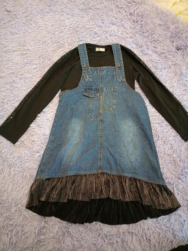 Джинсовий сарафан з кофтинкою. На зріст 140.Заміри: кофтинка: ПОГ 37см довжина по спинці 54см довжина рукава від плеча 48см Сарафан довжина по спинці від плеча 78 см. Поб 44 см.