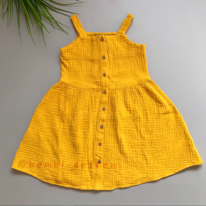 Сарафан для дівчинки на літо ТМ Бембі на бретельках, відрізний по талії. По переду застібка на гудзики. Матеріал - муслін, 100% бавовна. Розміри 134 і 146. Колір охра.