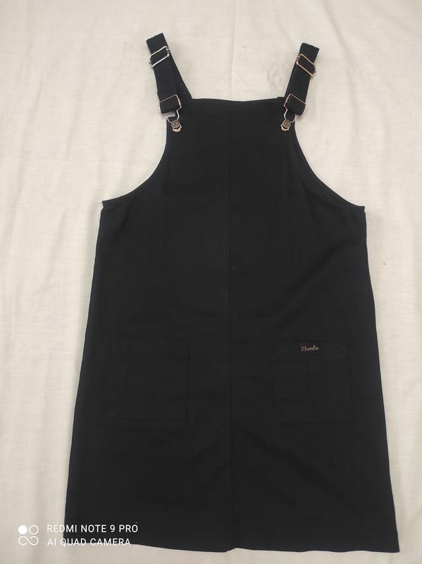 Сарафан для дівчинки відомого українського бренду Зіронька чорного кольору з літнього джинсу в ідеальному стані, розмір 164, має дві накладні кишені, бретелі, що регулюються на металевих закрепах. На кармані металевий брендовий логотип Зіронька. Ідеально підійде для школи, гарно виглядає як з футболками, так і з гольфами та лонгслівами Все сезон ПОГ 43 ПОБ 47 Довжина виробу 66 від застібки