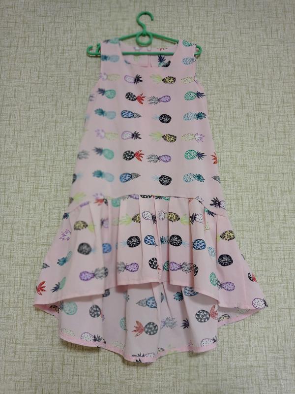 Легкий,літній сарафан,є дві кишені,застібка змійка. Низ плаття асиметричний,перед коротше, зад довший.