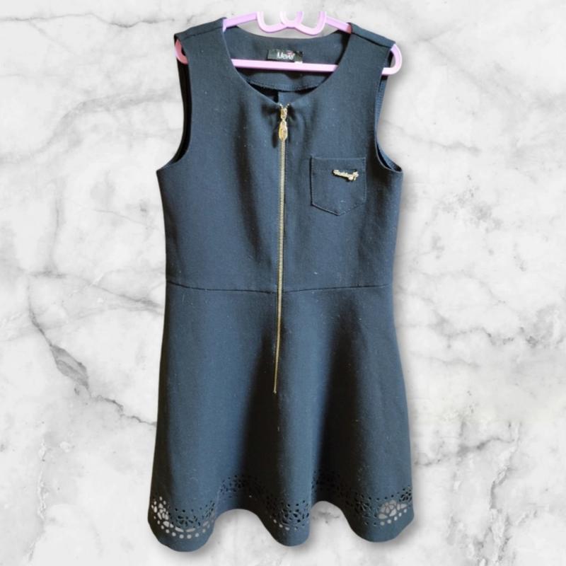 Сарафан з металевою блискавкою, є маленька кішенька. По низу спереду перфорація. Синього кольору на зрізт до 134 см. І