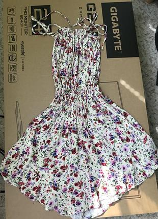 На 32 розмір, ніжний сарафан шортиками, на завязках- можна регулювати