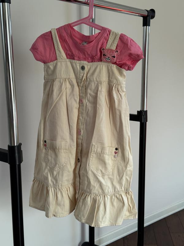 Комплект: сарафан з тоненького джинсу та футболочка Матеріал: футболка - 100% бавовна, сарафан - теж 100% бавовна - тоненький джинс. Виробник: Іспанія Розмір: 128 см На 7-8 років Додатково можу надіслати заміри Стан: новий, жодного разу не одіваний, з бірками. Тільки ґудзичок один потемнів (останнє фото)