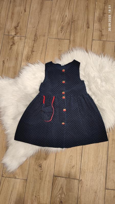 Плаття сарафан, для дівчинки синього кольору в горошок, є кишенька та гарні пуговиці у вигляді вишеньки