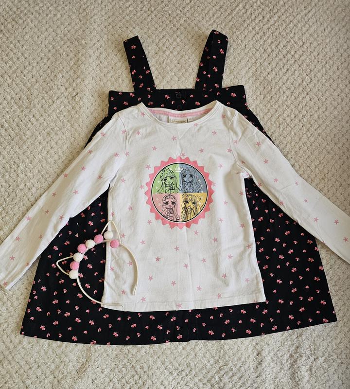 Сарафан для дівчинки 5 – 6 років. Дуже милий) 100% котон. На зріст 116.Стан ідеальний. Дуже гарно з білою футболкою під низ. Довжина сарафану - 52см. ПОГ - 30см. Довжина бретельок - 13 см. Все що на фото йде у подарунок) Кофточка на зріст 122. Нажаль має кілька невеликих плям - але зовсім не помітні. Довжина рукава 41, самої кофтинки – 40 см.