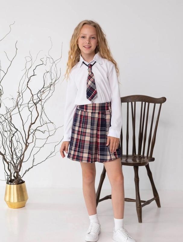 Вишуканий комплект для дівчинки - тканина блузи: софт - спідничка: тіар плісе - в спідничці на спинці є резиночка,застібка на блискавку сбоку - галстук на резиночці зйомний Заміри: рукав від плеча/довжина/ пог спідничка довжина/бедра/ пояс Допустима похибка (+-2см) 122 - 43/51/38/33/33/27 128 - 45/53/39/35/34/28
