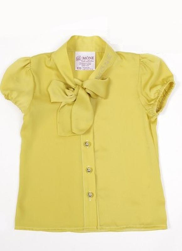 Очаровательная блузка фисташкового цвета с коротким рукавом для девочки от ТМ MONE. Стильная блуза декорирована очаровательным большим бантом спереди, что делает её оригинальной. Интересный дизайн привлечет внимание как взрослых, так и сверстников малышки. Отлично подойдет к школьной форме или праздничному наряду. В наличии на рост 122 Замеры на рост 122 см: Ширина плеч 26 см Расстояние от горловины до плеча 6,5 см Полуобхват груди 32 см Длина рукава наружная 12,5 см Длина изделия 43,5 см Длина от проймы до низа 28 см