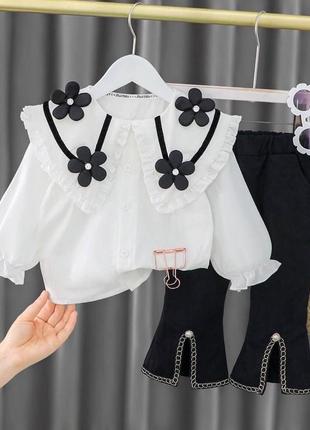 Дуже гарний нарядний костюмчик для дівчинки 🥰 Сорочка +штанці кльош Матеріал сорочки -бавовна Штанці -костюмка Блуза -бавовна Декор (квіточки ) знімаються Нереально стильні та нарядно виглядає на дітках 😍 Ви будете у захваті ✨ Код: 22 100 - штани: довжина 52 см, крок 33 см, бедра 27 см блузка довжина 39 см, пог 31 см, рукав 34 см 110 - штани: довжина 57 см, крок 36 см, бедра 28 см блузка довжина 41 см, пог 32 см, рукав 36 см 120 - штани: довжина 61 см, крок 40 см, бедра 29 см блузка довжина 44 см, пог 33 см, рукав 39 см 130 - штани: довжина 66 см, крок 42 см, бедра 30 см блузка довжина 47 см, пог 34 см, рукав 41 см 140 - штани: довжина 72 см, крок 45 см, бедра 32 см блузка довжина 49 см, пог 36 см, рукав 44 см Замір рукава від плеча 🧸Ціна 765 грн