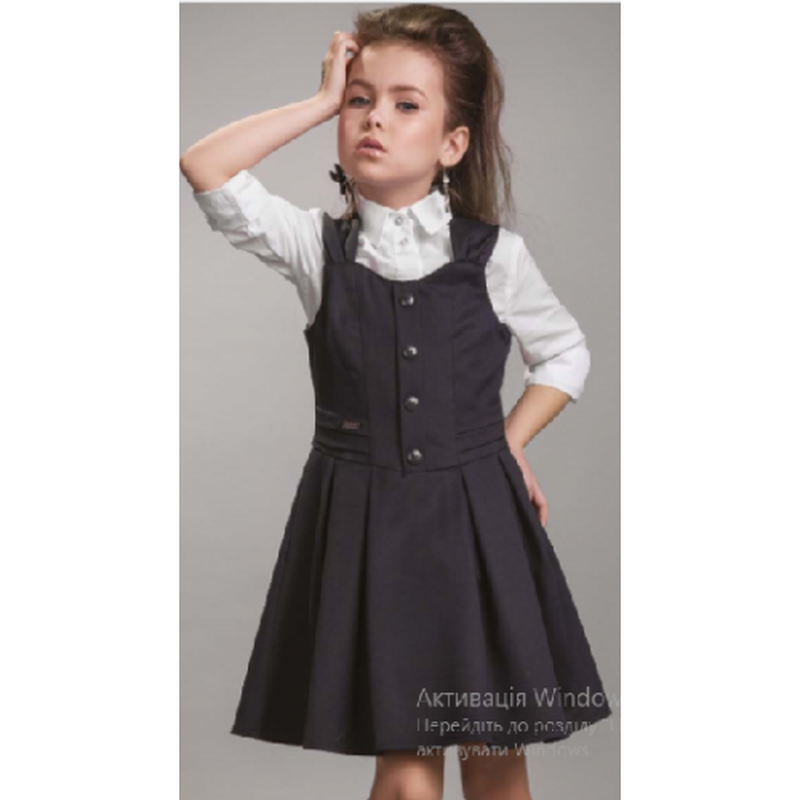 Комфортний та практичний сарафак чорного кольору. Спідниця кльош, є бавовняна підкладка. Спереду гудзики обманки, збоку потаємний замок. Чудово підійде до будь якого гольфика чи блузки. Розміри:116,128.