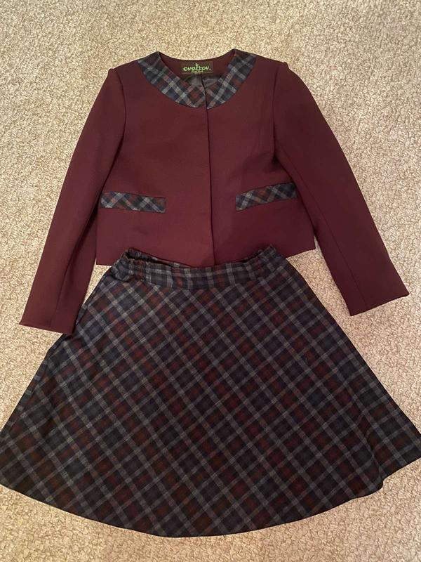 Продам школьную форму для девочки: пиджак + юбка. Футболка и водолазка в подарок. Состояние идеальное. Ткань формы не мнётся, носится очень хорошо. Пиджак застегивается на кнопки, на юбке в талии есть резинка и застёгивается на пуговицу и молнию. Замеры пиджака: длина от плеча 40 см, длина рукава 48 см без заворота (с заворотом 43 см), ширина плеч 30 см, ширина под руками 38 см, ширина внизу 38 см. Юбка: длина 42 см, ширина в талии от 28 до 36 см, бёдра свободно.