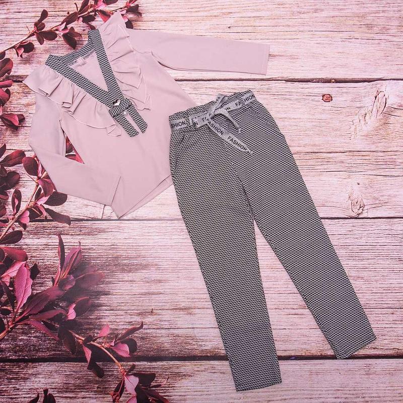 Костюм з блузою 122,128,134,140,146 Заміри Блуза:полуохват груди;длина рукава;довж по спинці 122:33/44/47 128:34/46/47 134:35/48/50 140:36/49/50 146:38/51/51 Брюки:полуохват резинки;довж;шаг: 122:25-33/73/52 128:24-34/78/56 134:26-35/82/61 140:27-36/87/63 146:27-37/93/66 можлива похибка +-1-2с