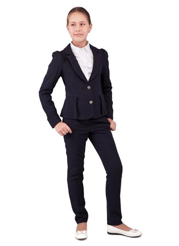 Жакет Кокетка полуприталенного силуету виконаний з стрейчевой костюмної тканини. Комір класичний, лииния талії відрізна, по нижній частині жакета виконані складки. По нижній частині рукава закладений фігурний відворот, що дозволяє регулювати довжину рукава. По окату рукава закладені складки,що надає йому більш опуклу форму. Штани Кокетка виконані в класичному стилі з кишенею з стрейчевой костюмної тканини. Лінія талії занижена на 3 див. На поясі по спинці закладена гумка, яка дозволяє одягнути штани на дитину з талією на 2-3 см. більше. Так само по поясу є шлевкі, які дозволяють носити виріб з ремінцем для більш худеньких дівчаток. Довжина штанів закладена з запасом. Кольори: синій Розміри: 38(зростання 146см)