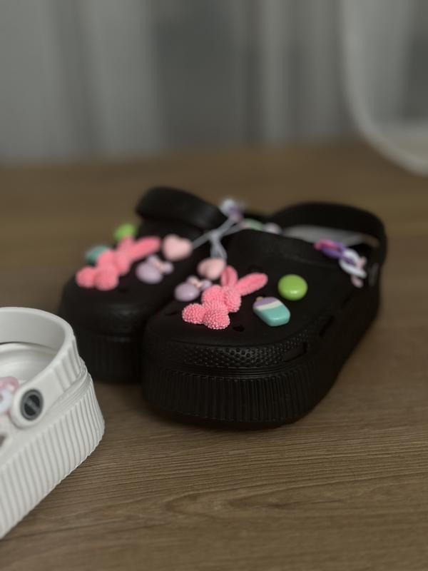 Крокси на маленькі ніжки Детальки всі знімаються . Дуже легенькі та зручні В розмірах 30-35 Чорні 30 розмір на ніжку 17,5-18 см Білі та розові 31 розмір на 18.5 - 19 см Розові 33 розмір на ніжку 20-20.5 см Розові 35 розмір на ніжку 21 -21.5 см