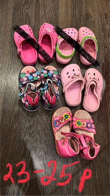Крокси на дівчинку 1 лінія розмір 22-24 розмір 2 лінія 23-24 розмір 3 лінія 26 розмір Кроки з Мікі троянд та зелені з морською зіркою-100грн Інші всі по 50грн Босоніжки 1 лінія розмір 24 2 лінія розмір 26 Усі босоніжки по 50грн