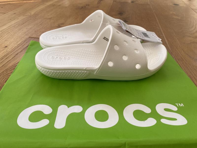 Білі капці CROCS Classic . Зручні. Це стильна і легка модель, з комфортом класичних сабо .Неймовірно легкі. Легко чистити і швидко сушити. Литий полімерний матеріал Croslite ™забезпечує комфорт і Оригінал. Купували на розпродажі у Німечині за 19.99. Євро. Перша ціна була 32.00 Євро Є місце для декору джибітсами Розмір J4, на 36-37 розмір Повна довжина підошви від краю до краю-24 см По масажним точкам - 22,5 см