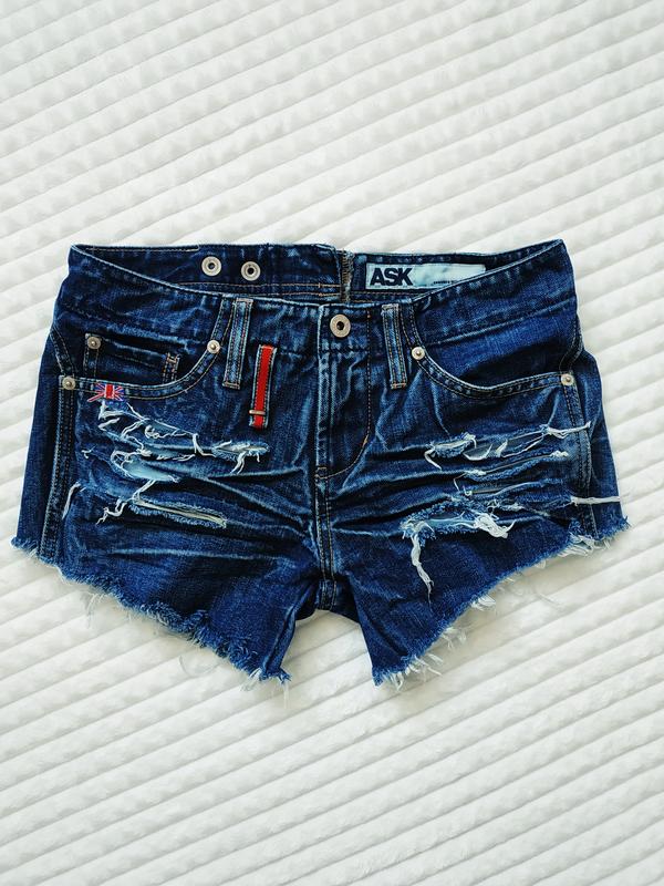 Джинсові шорти ASK. Стан ідеальний. Розмір 26. Ширина в поясі - 38см(можна звужувати - на кнопці), ширина в бедрах - 47см, довжина - 23см.