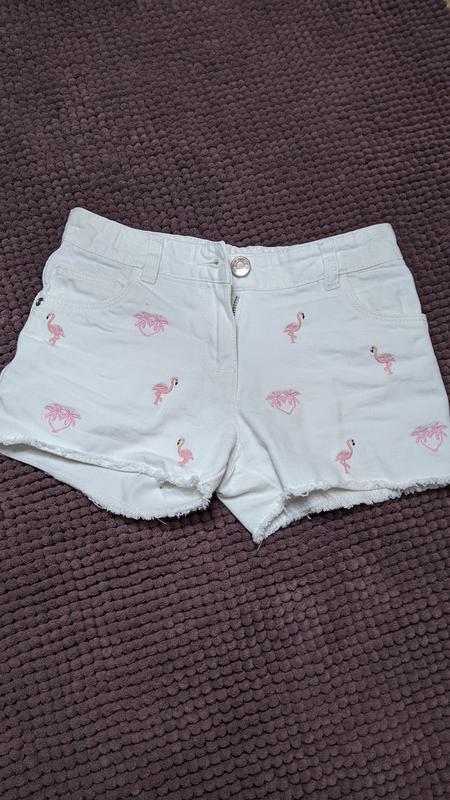 Коттонові шорти з вишитими фламінго. трохи забруднені. Відіпрати не пробувала. розмір вказано на 8р. але маломірять на розмір. є утяжка