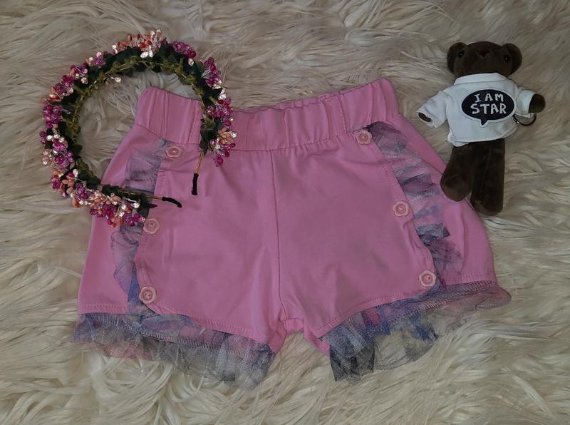 Шорти для дівчинки, бавовна 95%, еластан 5%, пояс резинка, спереді прикрашені фатином та гудзиками, ззаду карман. Заміри: пояс- 23,5 см. бедра - 34/35 см. посадка спереду - 18см. посадка ззаду - 22см.