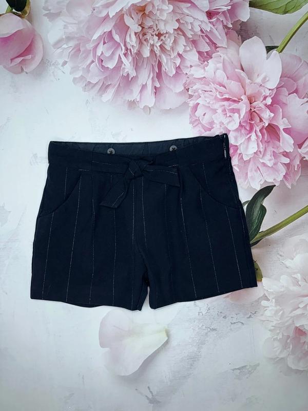 Тканинні класичні шорти Збоку є змійка для зручності надягання У талії регульована утяжка Спереду 2 кишені, ззаду імітація кишень Смужки з люрексу 🏷️Okaidi 7 лет/122 Довжина 26. ПОТ 30