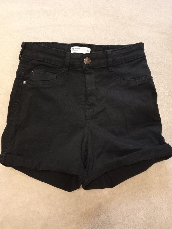 Шорти джинс чорного кольору з манжетами. Вказаний розмір - 34. Виміри: ПТ - 30 см ПБ - 38 см Довжина - 29 см Шаг - 8 см Висота посадки - 27/32 Ширина штанини - 22 З Укрпоштою по безпечній оплаті не працюю!