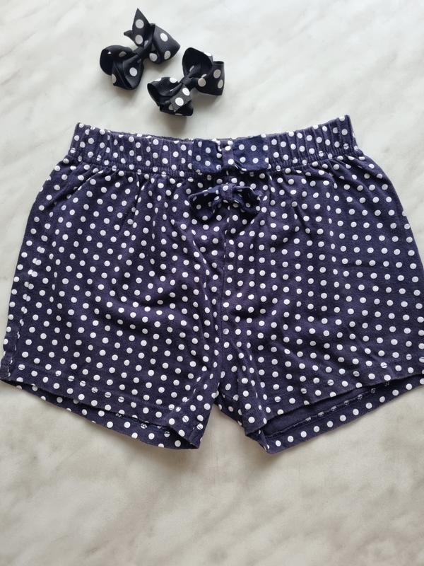 милые трикотажные шортики в горошки, тёмно синего цвета высота 21 см ширина 22 см, резиночка мягкая приятные на ощупь, держут форму и не растягиваются.