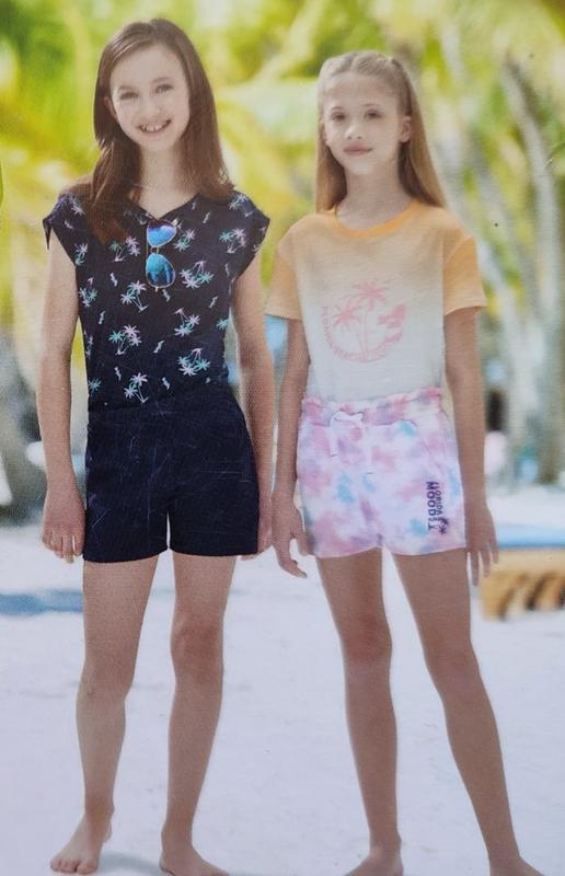 Шорти трикотажні Pocopiano для дівчинки У комплекті 2 штуки: темно-сині однотонні + рожеві в принт "Тай дай". 60% бавовна + 40% поліестер, двунить Розмір на 10-11 років, зріст 146 см. Ціна вказана за комплект із 2 штук.
