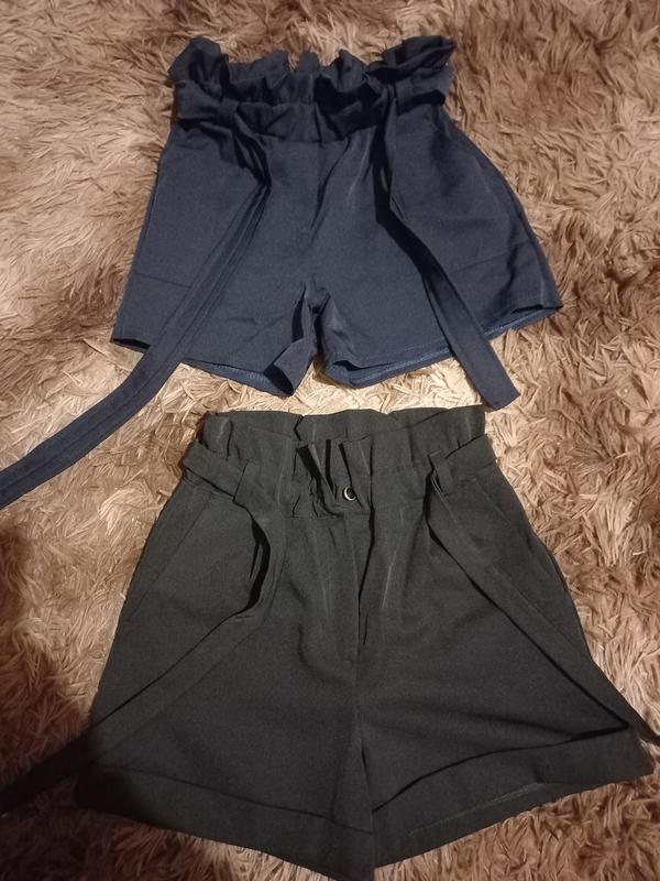 Темно сині 134-140р. Пояс гумка 28 см, стегна 42. Чорні 146р пояс гумка 28 см, стегна 42-43 см. Тканина костюмна на обох шортах. Сіст. чудовий. Ціна за одні 40 грн