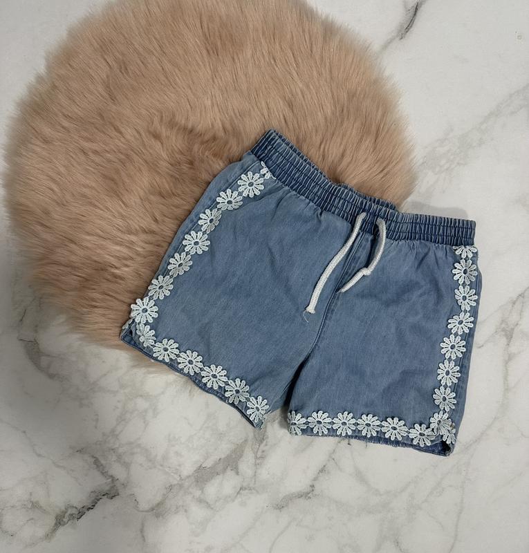Стильные шортики на 3-4 года, состояние идеальное но на одном цветочке есть маленькое пятнышко, при носке не заметно, но можно вывести, за счет этого и цена такая
