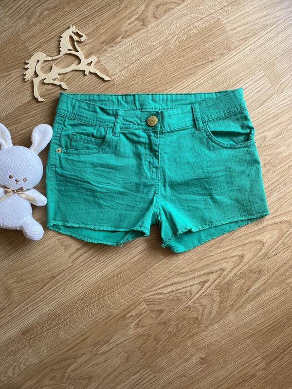 Чудові шортики на дівчину підлітка, розмір вказаний 164. Тканина тягнеться. Заміри: Довжина по боці 25,5 см ПО поясу 37 см ПОБ 43 см Висота посадки спереду 19,5 см, взаді 30,5 см Ширина штанини внизу 25 см
