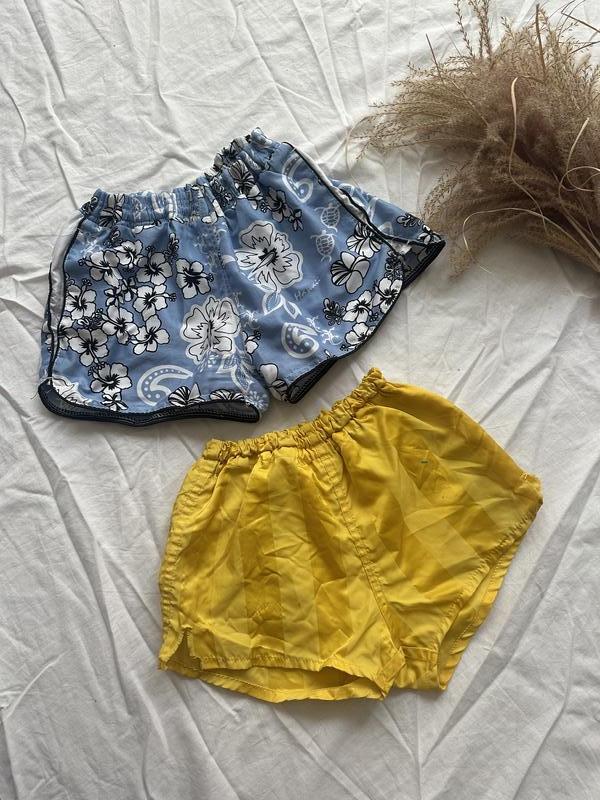Довжина жовтих 23 см/ Пот 24-26 см/ Поб 40 см/ Висота посадки 24-27 см/ Шаговий 4,5 см/ Знизу штанини 21-22 см/ Довжина синіх 25 см/ Пот 24-36 см/ Поб 47 см/ Знизу штанини 29-30 см / Висота посадки 21-25 см/ Шаговий 5 см/ З нюансів-місцями є плями і знизу розрізи роспорки/все видно на фото/оцінено дешевше/ Продається без повернення/ Сині можуть бути і для дорослих на (с)