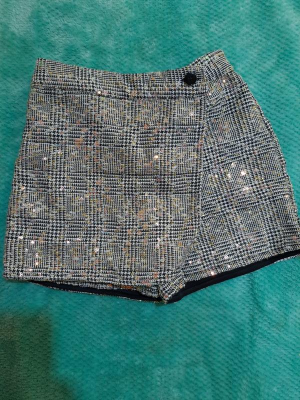 Изысканные шортики, классические, спереди выглядят как юбочка, интересная ткань, сочетающая классический узор и пайетки.