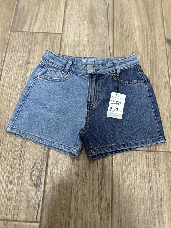 Джинсовые шорты на девочку 9-10 лет, рост 140см, очень стильное сочетание, светлого и темного денима, есть карманы, новые