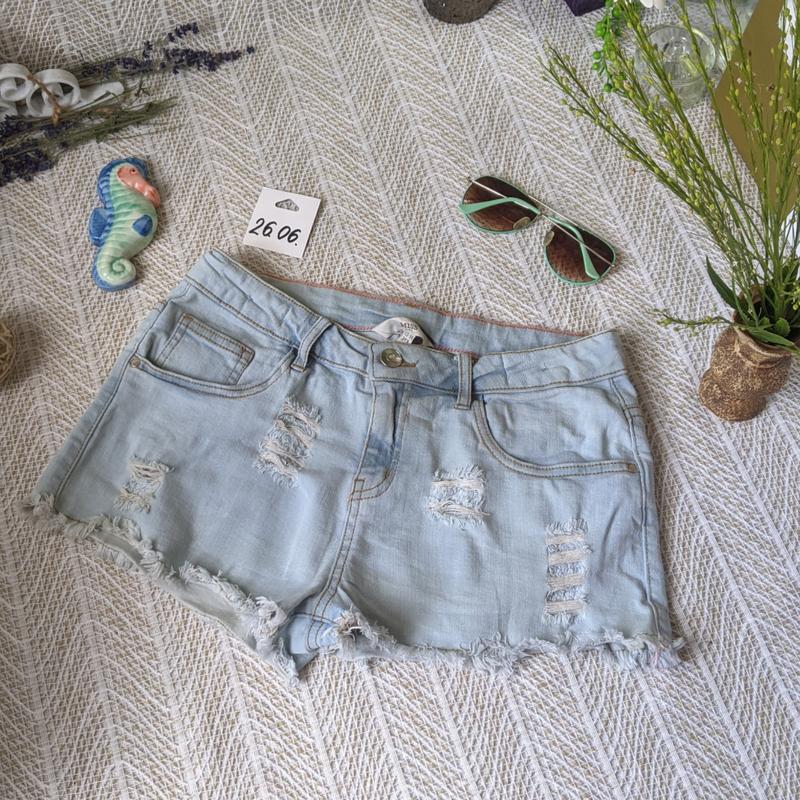 блакитні шорти джинсові з рідними дирками бедра до 54 талія 33 42 утяжка стан гарний не ідеальний )