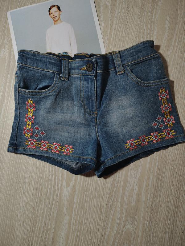 Джинсові шорти з вишивкою Nutmeg 140 см. стан ідеальний на утяжці. Довжина - 23 см напівталія - 32 см. глибина - 20,5 см. напівбедра - 35 см.